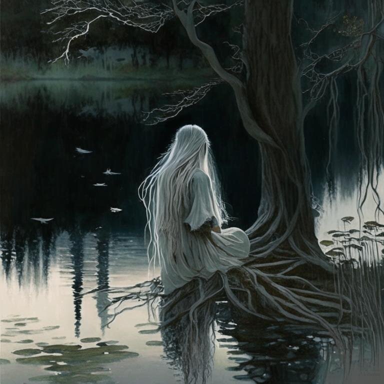 Она сидит на берегу озера, расчесывает длинные белые волосы. Подол широкой рубахи окунулся в темную воду, но незнакомке все равно. Что-то напевает негромко… Слов не разобрать, протяжная мелодия отдается эхом от озерной глади, растворяется в воздухе, теряется в ветвях деревьев.