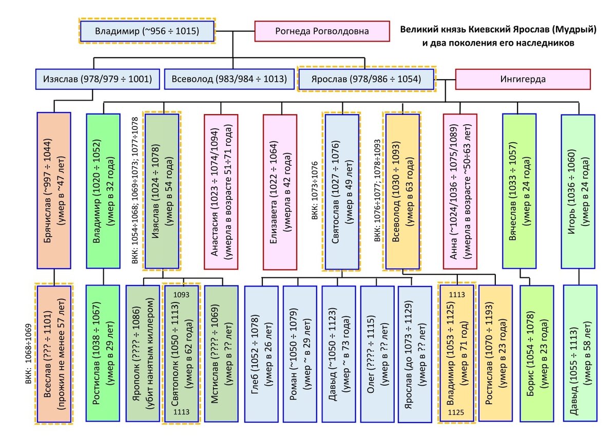 Поэтому проблематика замещения должности номинального главы [несуществующего] государства, а по сути – старшего Рюриковича перешла в компетенцию к представителям следующего поколения – правнуками Ярослава (Мудрого), коих, на момент ухода Владимира Мономаха, пребывало в добром здравии – не менее тринадцати человек. Пятеро были сыновьями почившего Великого князя, пятеро – сыновьями его двоюродных братьев Олега Святославича и Святополка Изяславича и трое – сыновьями, уже упомянутого Ярослава Святославича (Черниговского) – “изгоя”...