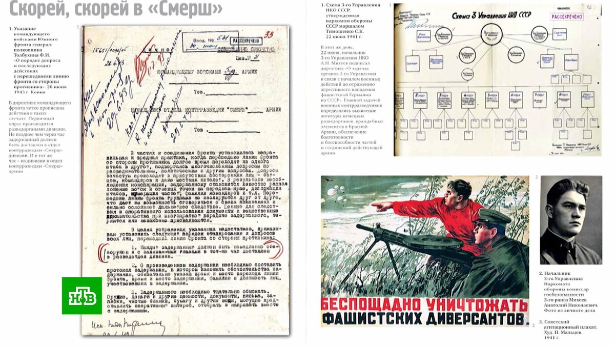 [ Смотреть видео на сайте НТВ ] Сегодня исполняется 80 лет со дня создания Главного управления контрразведки Народного комиссариата обороны СССР, легендарного «Смерша». За годы Великой Отечественной войны разведчики «Смерша» обезвредили около 40 тысяч шпионов, диверсантов и террористов и внесли бесценный вклад в Победу над фашистскими захватчиками. К круглой дате ФСБ обнародовала ранее не публиковавшиеся документы. Среди них, в частности, секретное постановление о создании спецслужбы − это была личная инициатива Сталина. Главной целью организации была борьба с разведкой врага. Сотрудники «Смерша» собирали ценные данные о намерениях противника, а его самого вводили в заблуждение с помощью дезинформации. Как отмечает генерал-лейтенант ФСБ Александр Зданович, главный показатель работы работы «Смешрша» не то, сколько агентов разоблачила эта спецслужба, а сколько спасла жизней советских солдат и офицеров. В середине 40-х сотрудникам «Смерша» удалось пресечь три попытки покушения на советско