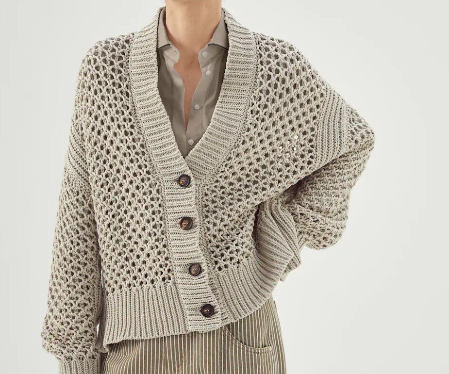 Продолжаю историю про посещение магазина Кучинелли. Внимательно изучив кардиган, о котором писала чуть раньше и кстати нашла в интернет – магазине. Он там выглядит намного привлекательней, чем на вешалке и стоит 171 500 р. Это я к тому, чтобы поднять самооценку мастерицам. Отправляюсь по магазину дальше. Теперь мое внимание привлекло вот эти 2 платья. Связаны они, как видно, одинаковым несложным ажуром. Пряжа одинаковая по фактуре: сочетание хлопковой нити с нитью льна и шелка с маленькие пайетки.(46% ХЛОПОК, 40% ЛЕН, 14% ШЁЛК) 1 платье, видимо предназначено для лета. Длинное, с глубоким V – вырезом как впереди, так и сзади, с большими проймами, низ изделия с неширокой резинкой. Вырез и проймы связаны резинкой 1 на 1. На первый взгляд платье кажется легким, но стоит его потрогать, как становится ясно, что от легкости и воздушности нет и следа. Платье, на мой взгляд, тяжелое. 2 платье выполнено из той же пряжи, но в другом цвете. На этот раз это золото, но тоже с пайетками. Неглубокая к