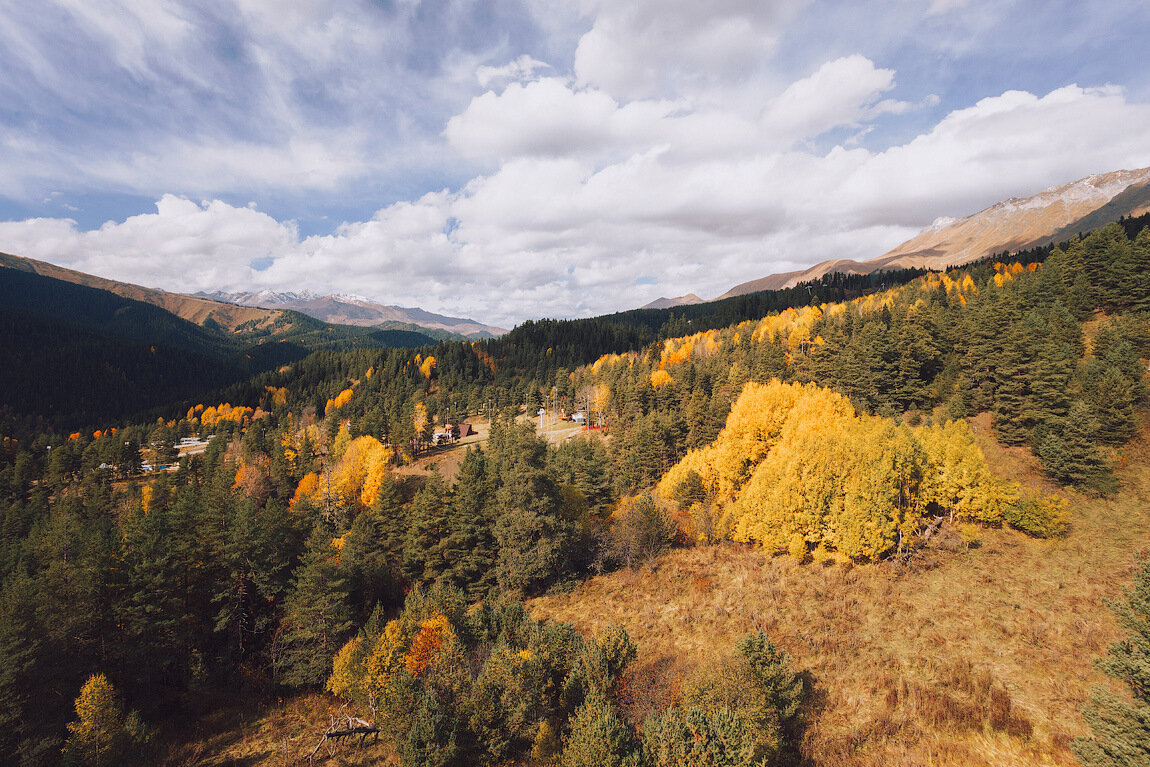 Дальше наш путь лежал в соседний поселок Нижний Архыз (43.681055, 41.462133), ведь рядом с ним есть интересный археологический комплекс. И вот мы уже двигаемся по идеальной асфальтовой дорожке вдоль реки Большой Зеленчук, наслаждаясь пестрой листвой горных склонов, периодически останавливаясь на фото-стопы. Сутра погода стояла очень солнечная и теплая. Но чем дальше мы удалялись от курортного Архыза, тем сильнее и плотнее нависали пушистые облака прямо по курсу. В какой-то момент голубое небо полностью скрылось от нас за густой пеленой, без солнечного света стало значительно прохладнее. Дорога все так же радовала красотой — пасмурная погода наоборот придавала еще большей загадочности горным пейзажам.