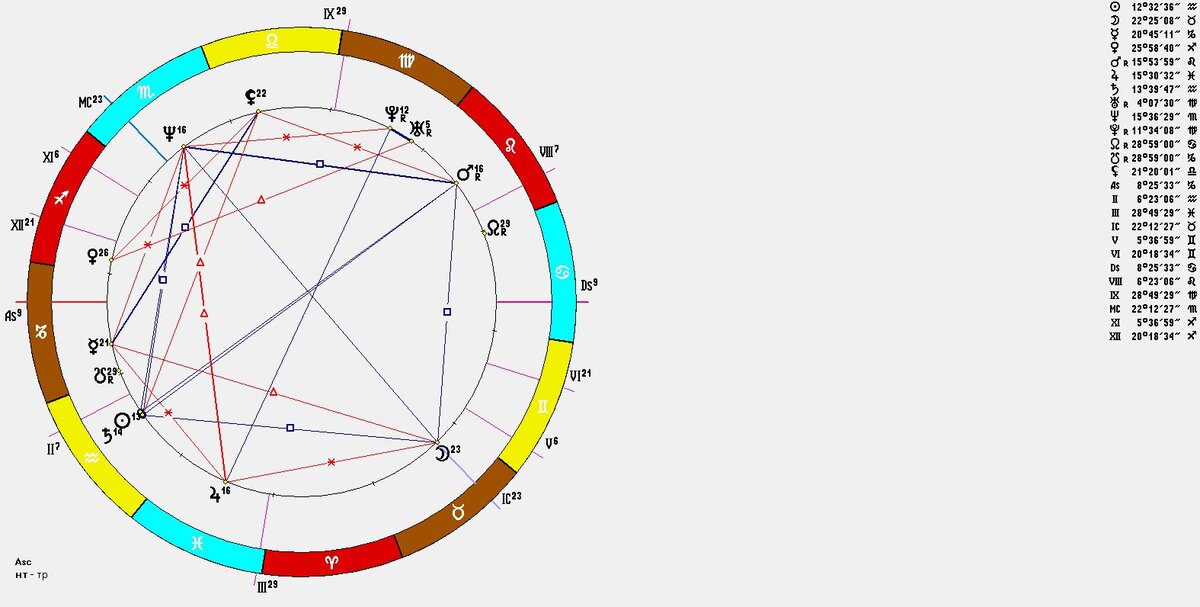 Но также мы видим, что Марс в Раке напряженный по аспектам - частые разочарования в отношениях, конфликты, расставания, раздражительность. Возможно партнеры "примагничиваются", ведущие нездоровый образ жизни или неготовые к серьезным отношениям, свободолюбивые (Уран в VII доме).