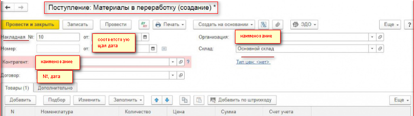 Рассмотрим основные этапы отображения давальческого сырья на примере учета у организации-подрядчика:
