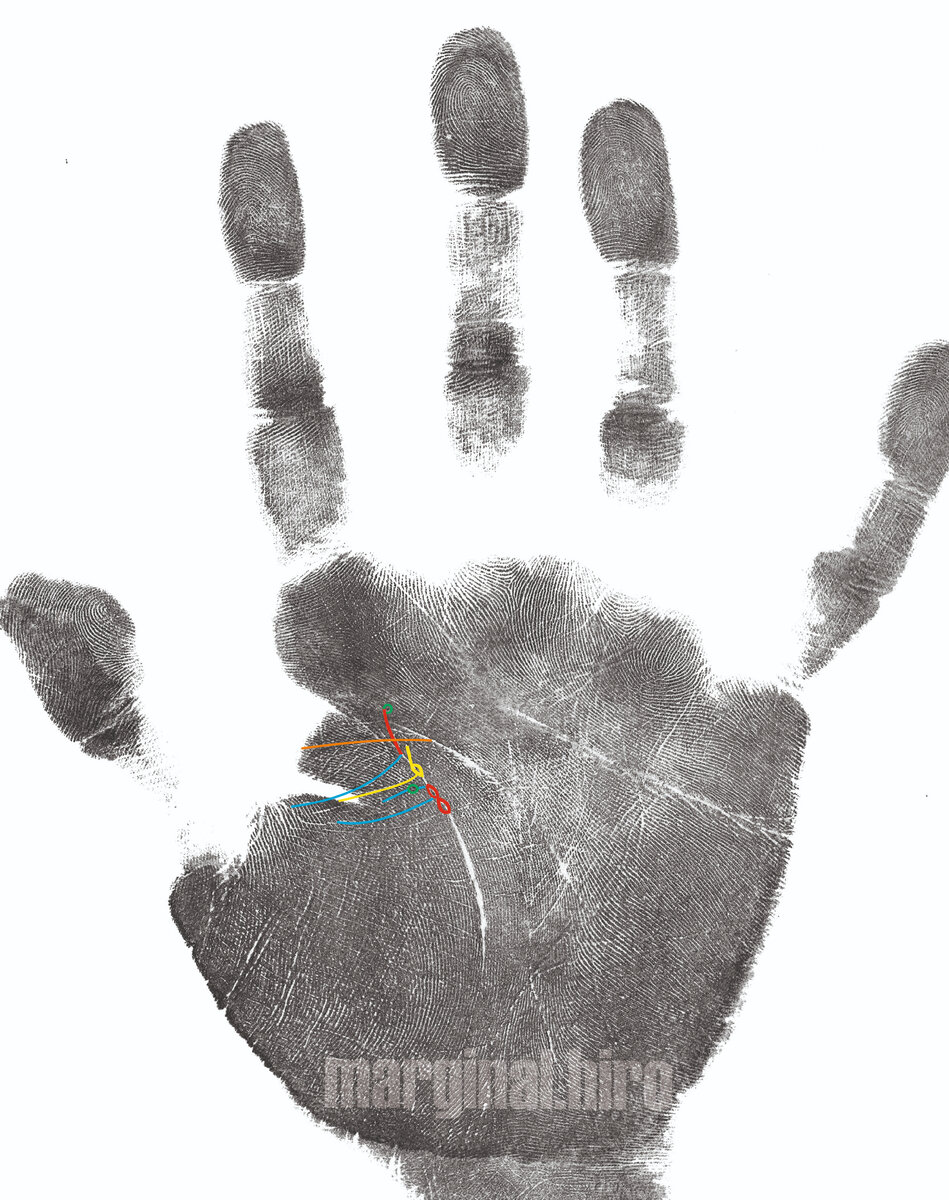 Аборт в 18 лет - линия из зоны детей ( голубой ) упирается в линию жизни, восходящая линия радости ( красный ) режется линией Марса ( оранжевый ) и оканчивается точкой ( (точечное поднятие папиллярного узора) зеленый круг ).