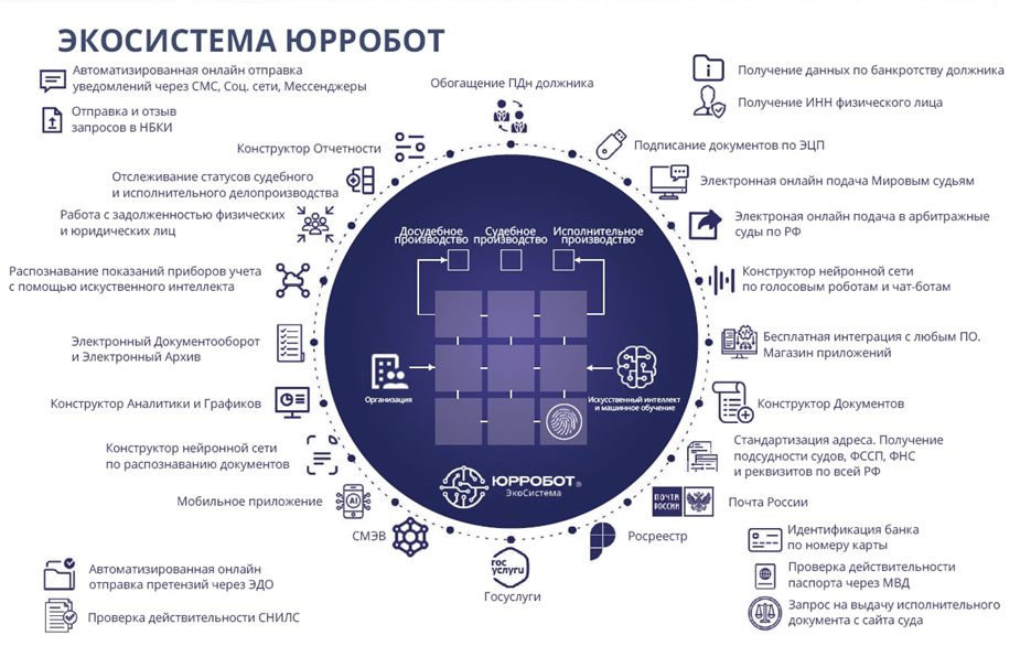 С помощью машинного обучения и искусственного интеллекта ЮРРОБОТ гиперавтоматизирует весь цикл работы с должником - от автоматического роботизированного обзвона, расчетов пени, госпошлины, определения подсудности, реквизитов суда и формирования электронного документооборота претензионно-исковой деятельности и до отправки документов в суд онлайн, используя электронно-цифровую подпись (ЭЦП), формирования вынесенного судебного решения для мирового судьи, исполнительного листа, запроса в ФНС/банки для судебных приставов. Платформу можно использовать на ПК с любой операционной системой, а также на планшетах и смартфонах.
