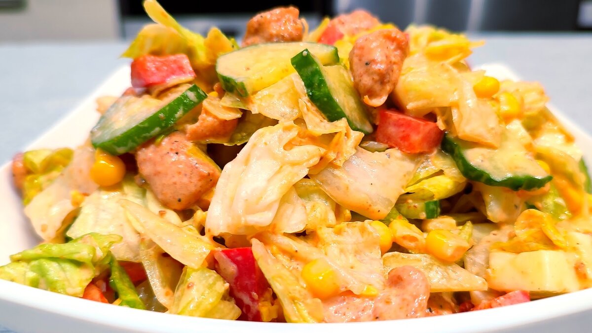 Привет дорогой подписчик и гость нашего канала! Сегодня готовим салат объедение. Ингредиенты: Салат Айсберг 1 кочан ( небольшой) Перец болгарский красный 1 шт Огурец свежий 1шт Филе куриной грудки 450 гр Сыр Моцарелла 150 гр Кукуруза консервированная 150 гр Паприка 1 ч. ложка Чеснок сухой 1 ч. ложка Карри 1 ч. ложка Масло растительное 3 ст. ложки Соль, перец по вкусу Заправка для салата: Сметана 15%жир. 3 ст. ложки Майонез 1 ст. ложка Паста томатная 1 ст. ложка Соль, перец по вкусу Приготовление: Первым делом нарезаем на небольшие кусочки филе куриной грудки. К филе добавляем сухой чеснок, карри, копченую паприку, соль и растительное масло. Все хорошо перемешиваем и оставляе мариноваться на 30 мину. Далее нарезаем овощи салат Айсберг, огурцы, болгарский перец и сыр моцарелла. На сковороде с добавлением растительного масла обжариваем куриную грудку. Обжариваем до готовности, главное не засушить. Собираем салат, смешиваем все ингредиенты овощи, сыр, курицу и добавляем консервированную с