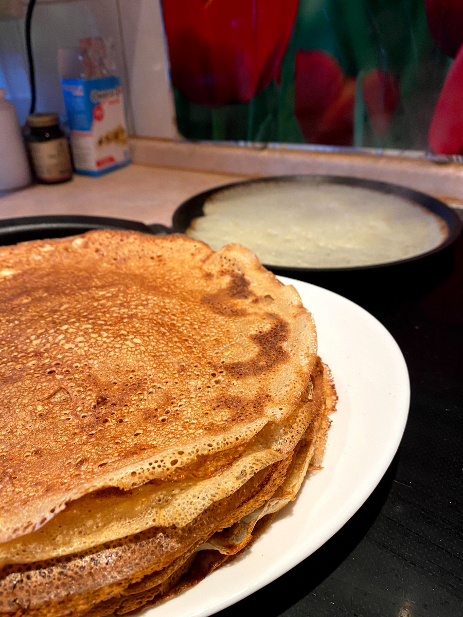 Ингредиенты : 1 литр молока 3 яйца 4 столовых ложки сахара + ванилин по вкусу 1/3 ч. л. соли 270гр.муки+О,5ч. л. coды + 3 ст.л. оливкого масла Приготовление: Взбить яйца с солью, сахаром и ванилином, добавить половину молока. После добавить муку с содой и взбить. Влить оставшиеся молоко и оливковое масло. Дать тесту постоять минут 5 и выпекать на хорошо разогретой сковороде.