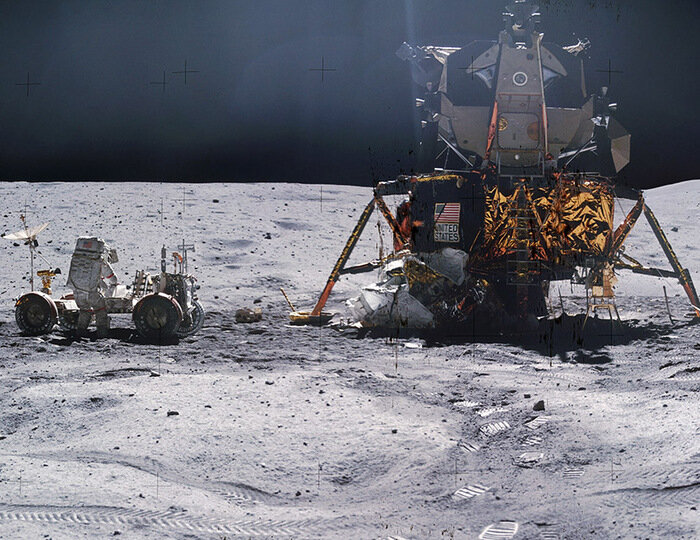 Интересно: цветная телевизионная камера с 6-кратным объективом-трансфокатором, установленная на луномобиле, была оснащена электроприводом для поворота в горизонтальной и вертикальной плоскостях и изменения фокусного расстояния, благодаря чему ею могли управлять не только астронавты, но и оператор с Земли. Это значительно расширило возможности видеосъемок и даже позволило заснять старт лунного модуля с Луны. Для выполнения такой съемки луномобиль пришлось заранее оставить на спутнике в нужной позиции и на таком расстоянии от модуля, чтобы в поле зрения его телекамеры он попадал целиком.
