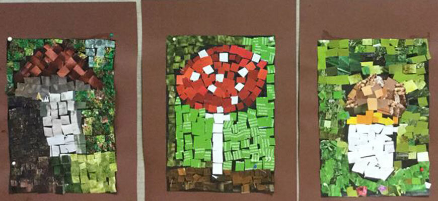 - Начинаем этими бумажными лоскутками выкладывать изображение грибка. То есть, приклеиваем лоскутки к ножке, шляпке, а если есть желание, то вдобавок делаем еще и фон. Например, зеленую травку. Понятно, что травка должна быть зеленой, ножка гриба – светлой, а шляпка – из какой-нибудь другой цветной бумаги. Это и будет бумажная мозаика.