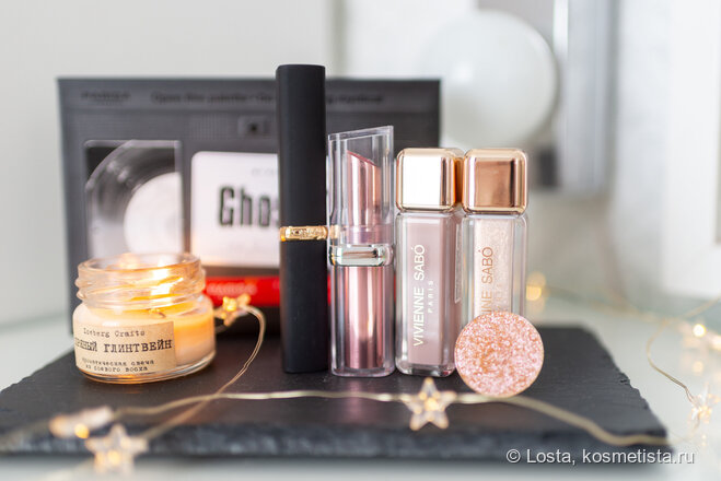 Бальзамная помада L'Oreal Paris Glow Paradise в оттенке 193 Rose MirageУвлажняющая матовая губная помада L'Oreal Paris Color Riche Intense Volume Matte в оттенке 482 Le Mauve IndomptableСпаркл Bernovich в оттенке X63Жидкие тени Vivienne Sabo Artiste 24/7 в оттенках 02 Brilliant Dore и 05 Gris Mat BeigeПалетка теней Parisa Cosmetics Ghost Tape #2