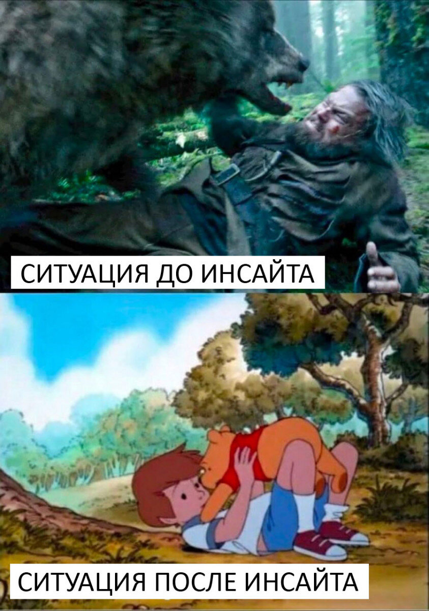 И снова немного о телесно-ориентированной инсайт-терапии. Когда Телесный инсайт не работает? Когда человек твердо уверен, что его травма ценна и объективна. Что это значит? Человек точно знает, что произошло в ситуации, кто там зло, а кто добро. Кого надо наказать, а кому отдать возмещение. В этом случае, наверное, и на любую другую терапию, работающую с травмами, ходить бесполезно. Травма слишком ценна в мире этого человека. Только вот травма находится внутри. В сознании, в мыслях, в теле. Тот медведь, напавший в детстве, может быть давно уж и сдох. Но каждый раз просыпается внутренний медведь, который начинает драть жертву как и в детстве. В Инсайте мы пересматриваем ситуацию не с позиции случившегося, а с позиции воспоминаний, внутренних образов и тенденций. Отношения человека к ситуации, а не объективной реальности как там все произошло. Мы, если честно, не пытаемся установить как там было на самом деле. Мы не следственный комитет и не историки. Да и память человеческая очень хрупк