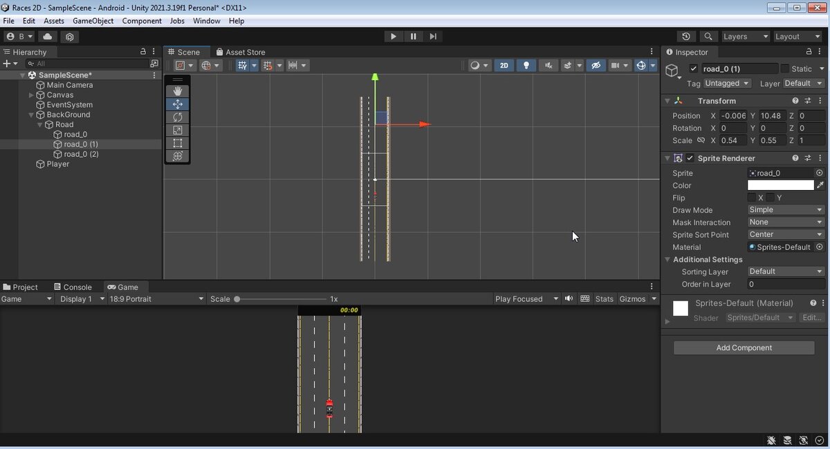 В дополнении этому элементу road_0 надо добавить еще два элемента: Box Collider2D (в строке is Trigger ставим галочку) и Rigidbody2D ( в строке Gravity Scale ставим 0).