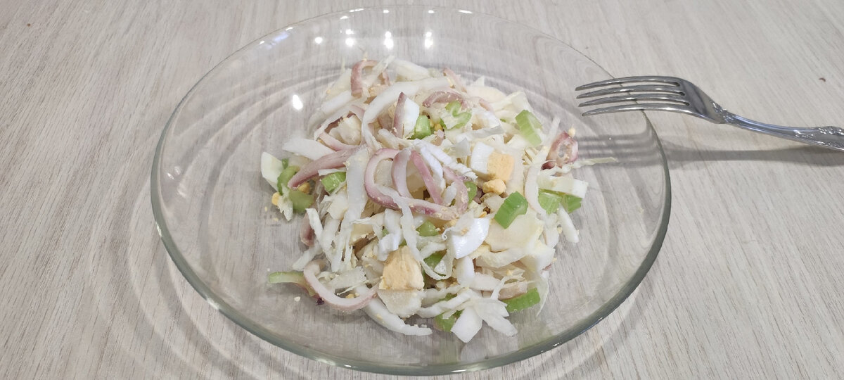 Сейчас я стараюсь чаще готовить на ужин салаты с белками и клетчаткой, ведь впереди лето и хочется хорошо выглядеть, не шокировать окружающих своими лишними колограммами. Обычно в качестве белка в диетических салатах выступает куриное мясо, яйца или кальмары. Сегодня хочу поделиться с вами одним из своих любимых рецептов салата с кальмарами. Итак ингридиенты: 1. Пекинская капуста. 2. Сельдерей стебли. 3. Отварные куриные яйца. 4. Кальмары. Ход приготовления салата: Пекинская капуста и стебли сельдерея измельчаются ножом. Яйца отвариваются и то же крошатся в салат, можно крупно. Кальмары очищаются от пленки, предварительно отвариваются в течении 1,5 минут и тоже режутся соломкой. Салат готовится просто и не требует особых умений, дальше просто добавить соль и перец по вкусу и заправить. В качестве заправки я обычно добавляю или смесь сметаны и зернистой горчицы. Но сегодня сметаны у меня в холодильнике не оказалось и я просто добавила немного майонеза провансаль. И знаете, получилось то