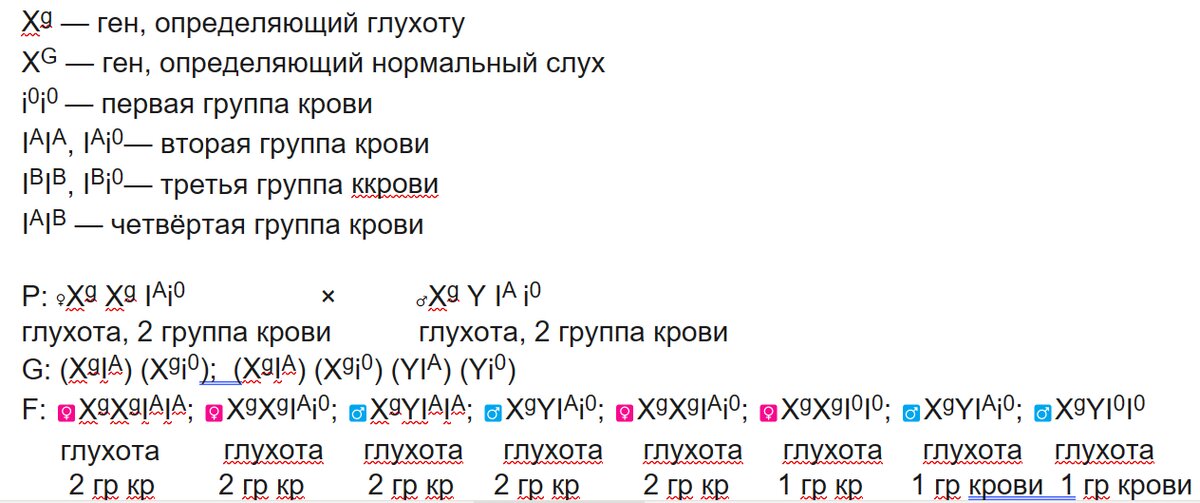 №1. Глухота передаётся по наследству как сцепленный с X-хромосомой рецессивный признак. Женщина, страдающая глухотой и имевшая 2 группу крови, отец которой имел 1 группу крови, выходит замуж за мужчину с 2 группой крови, мать которого также страдала глухотой. В результате этого брака у них родилась девочка с 1 группой крови. Будет ли слышать эта девочка? Определите вероятность рождения слышащих детей в этом браке. Определите все возможные генотипа и фенотипы детей. Решение: №2. Гипертрихоз передается через Y- хромосому, а полидактилия (шестипалость) — как доминантный аутосомный признак. В семье, где отец имел гипертрихоз и никогда не отмечался порог строения кисти у родственников, а мать страдала полидактилией, родилась нормальная в отношении обоих признаков девочка. Какова вероятность того, что следующий ребенок в семье не будет страдать ни одной из аномалий. Определите все возможные фенотипы и генотипы детей, рождённых в этой семье. Решение: № 3. Дальтонизм передается как сцепленный