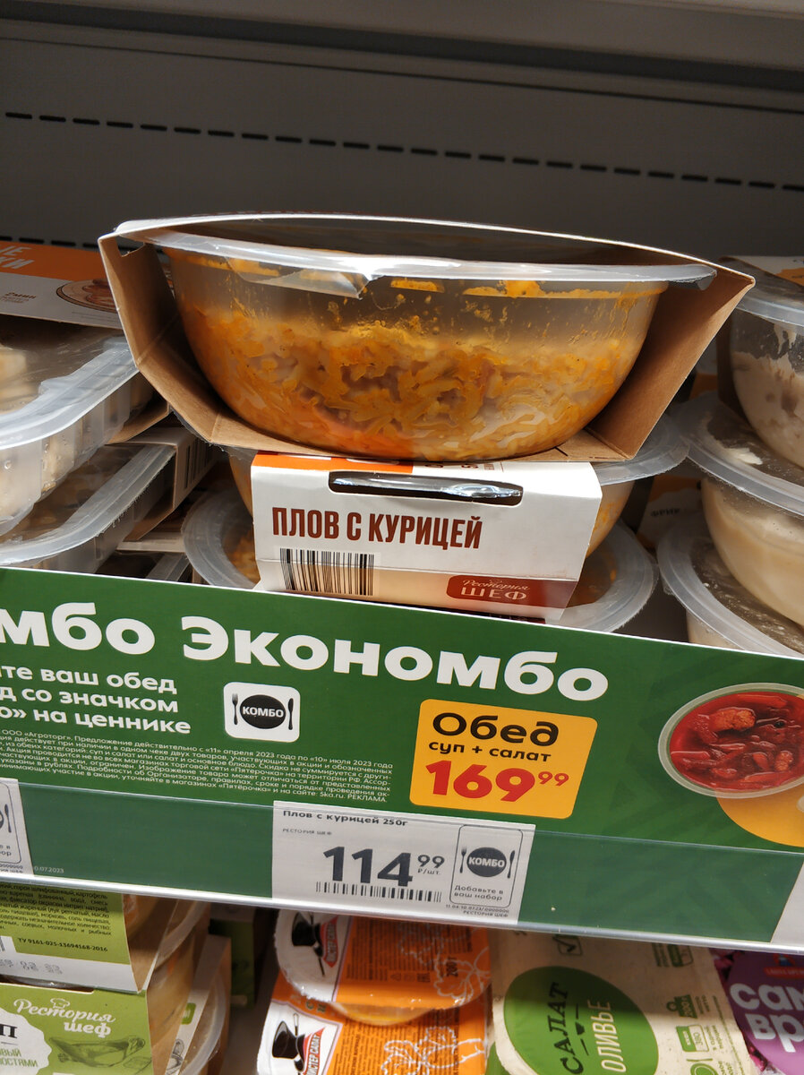 Приветствую, уважаемые! В Пятёрочке уже несколько месяцев нет плова с курицей от Рестории. И так же пропал рис по-тайски тоже с курицей, а были вкусные и раньше я их частенько на обед покупала, потому как в столовой и в кафе в это время народу много. Вот наконец появился плов, купила и не думала даже делать обзор, писать отзыв... НО, дернуло меня что-то посмотреть на состав и я, честно скажу, просто в шоке была! Но давайте все покажу, стоимость - 115 руб, немного подорожало с осени! Дизайн этикетки изменили. На состав глянула потому, что сам плов визуально из упаковки мне показался слишком "ПОКРАШЕННЫМ" в оранж. И вот, реально состав шокирует! СКОЛЬКО ЕШЕК!