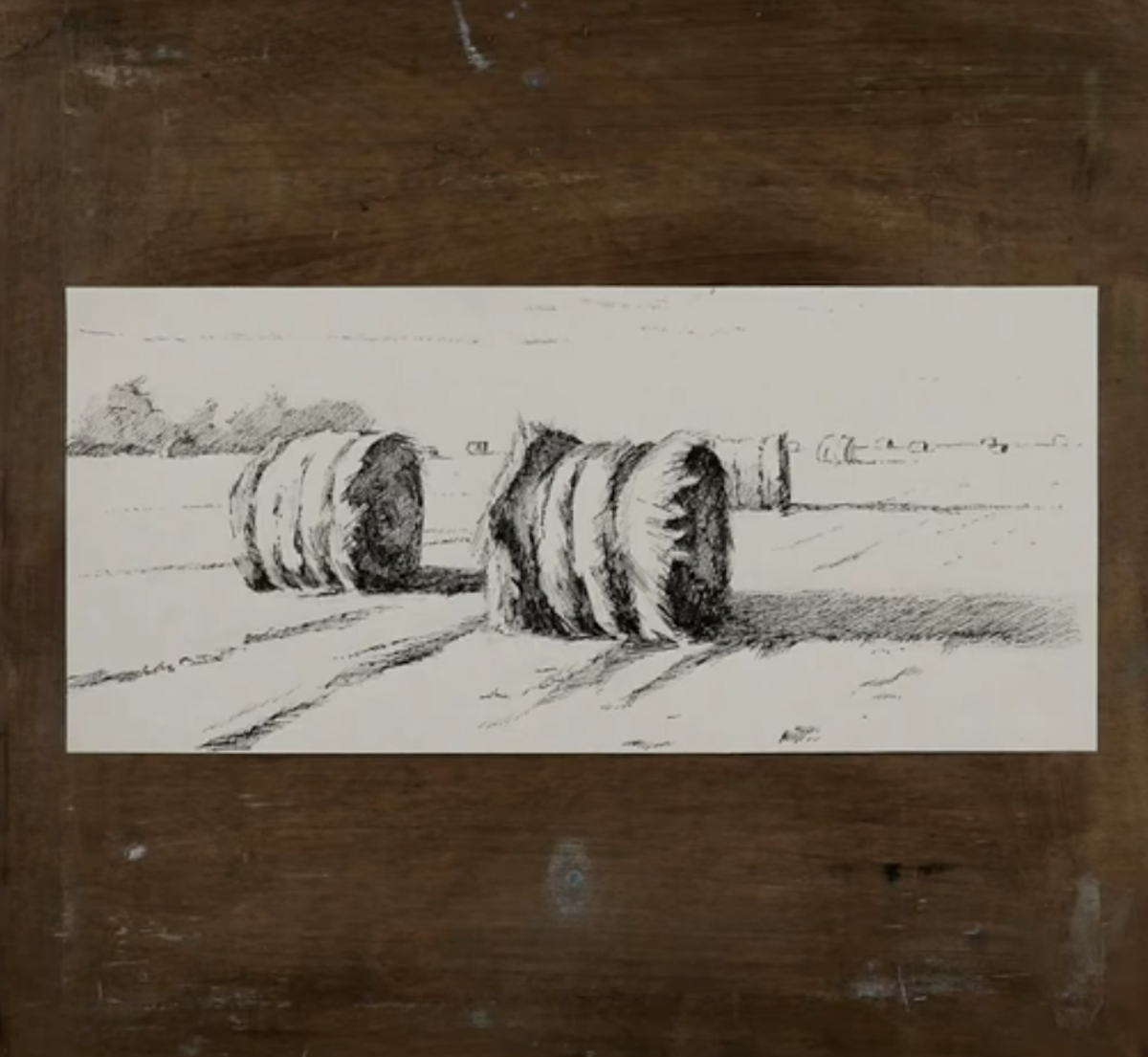 Наибольший контраст придется на границу света и собственной тени объекта как на место перелома формы. Когда в тени сформировалось достаточно цельное пятно, внутри него можно поработать штрихом по форме: на референсе видно, как закрученный объем сена образует спираль на торце стога – ее мы и покажем с помощью штриха, накладывая его по направлению спирали. Собственные тени должны быть разными на своих границах: где-то они будут четче, а где-то уходить в область полутона.