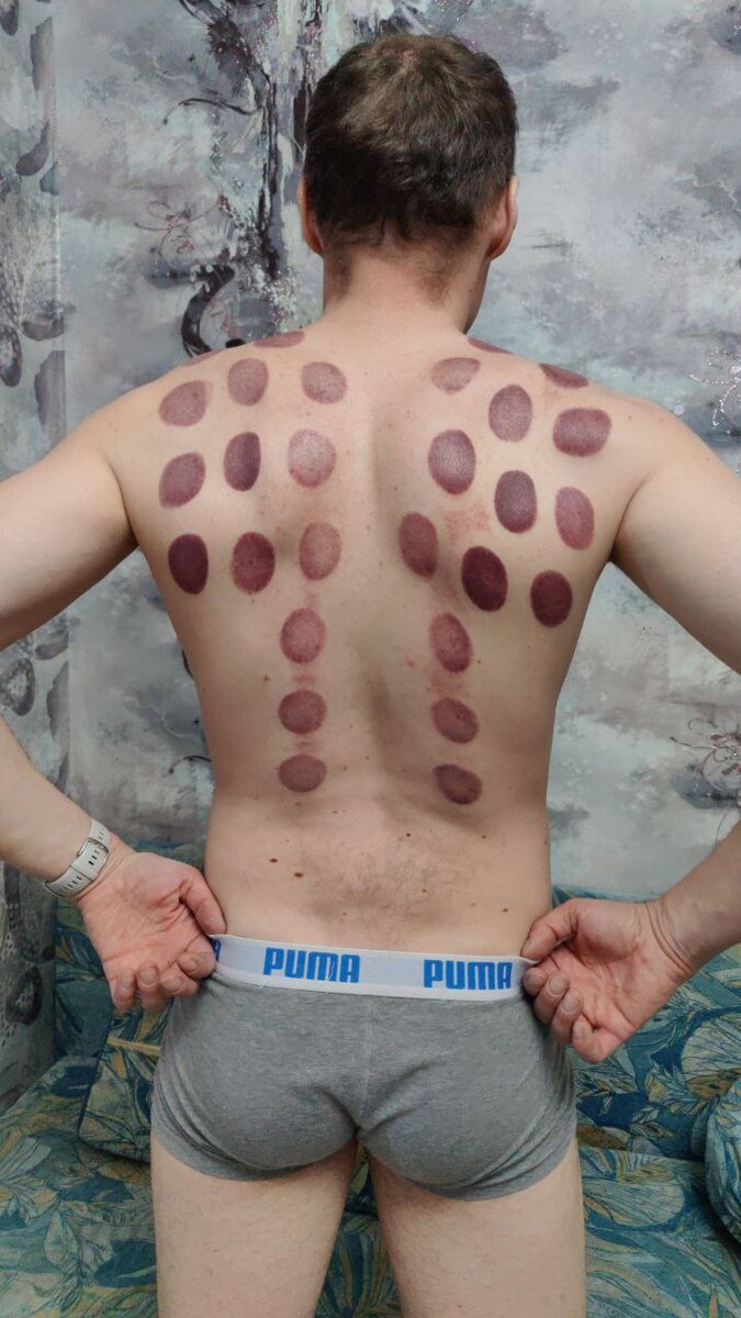 На днях заклинило шею, повернул в крайнее левое положение голову и не смог вернуть обратно. Было принято решение сходить на массаж. После консультации по телефону определились с массажем, это должен был быть спортивный массаж, с проработкой шейно воротниковой зоны. Массажист сразу сказала, будет больно говори, я говорил, но больно было все равно. Как я понял по наводящим вопросам, план моего массажа рождался здесь и сейчас. После того как меня хорошенько промяли руками в дело пошли подручные средства. Первым стал массажный пистолет. От его вибрации было приятно даже мозгу. Завершающим этапом стали банки. Больно не было, но зато как стало красиво, можно увидеть на фото.