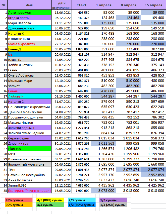 Участницы Записки ведьмы и Ягодка опять перешли из серого цвета в фиолетовый, а это означает, что они погасили 1/3 от долга: