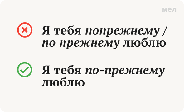 Вы по-прежнему плаваете в теме наречий? Или, напротив, отлично разбираетесь в их написании, ориентируясь по прежнему выпуску «Грамотности» на «Меле»? Сейчас поймем, а заодно закрепим правила. Правильно: по-прежнему Вспоминаем правило написания наречий, образованных от полных прилагательных или местоимений. Если в их составе есть приставка «по-», а оканчиваются они на «-ому», «-ему», «-цки», «-ски», «-ьи», то в написании нужен будет дефис. По-прежнему, по-моему, по-царски и так далее. Но, руководствуясь этим правилом, важно учитывать контекст и не путать наречие с прилагательным и предлогом. Сравните: «Я тебя по-прежнему люблю» и «Мы будем действовать по прежнему плану». Ещё больше весёлых и полезных карточек о русском языке — в «Грамотности» на «Меле» во «ВКонтакте». Подписывайтесь, чтобы всегда говорить и писать правильно! Фото: Pressmaster / Shutterstock / Fotodom