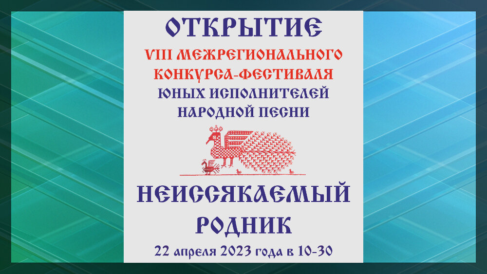VIII Межрегиональный конкурс-фестиваль юных исполнителей народной песни «Неиссякаемый родник» пройдёт 22 апреля в Брянской области. Его история началась в 2008 году, когда по инициативе директора Детской школы искусств имени М.П. Мусоргского города Фокино Брянской области Наталья Антонова организовала и провела настоящий праздник для юных исполнителей народной песни из разных городов России. С тех пор он становится площадкой для выявления новых талантливых исполнителей, служит популяризации народного творчества, пробуждает интерес к изучению историко-культурных ценностей, способствует возрождению национальных традиций. Конкурс проводится с целью активизации педагогической работы с одарёнными детьми. В конкурсе «Неиссякаемый родник» примут участие солисты и вокальные ансамбли народного пения детских музыкальных школ, школ искусств, учреждений культуры, образовательных учреждений. Участие в конкурсе-фестивале даёт возможность обменяться репертуаром, получить сценический опыт, завязать др