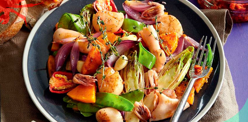 Ингредиенты: Для начала разогреваем духовку до 200 градусов. Очищаем чеснок от шелухи, измельчаем. Снимаем со стеблей тимьяна листики, измельчаем. Затем смешиваем чеснок и тимьян с оливковым маслом, солью и перцем. Замаринуем морепродукты в половине этой смеси на 15 минут. Затем нарезаем тыкву ломтиками, кочанчики цикория, перцы чили и луковицы шалота разрезаем вдоль на 2–4 части, поливаем оставшейся оливковой смесью. Берем форму для запекания, укладываем подготовленные ингредиенты и ставим в духовку примерно на 20 мин. Бланшируем зеленый горошек в слабо кипящей подсоленной воде в течение 1 минуты. Ставим на средний огонь сковороду-гриль. Выкладываем морепродукты, обжариваем по 1,5–2 минуты с каждой стороны. Подаем с запеченными овощами и горошком. Блюдо готово. Приятного аппетита! Ингредиенты: https://wildcrab.ru/news?id=2002