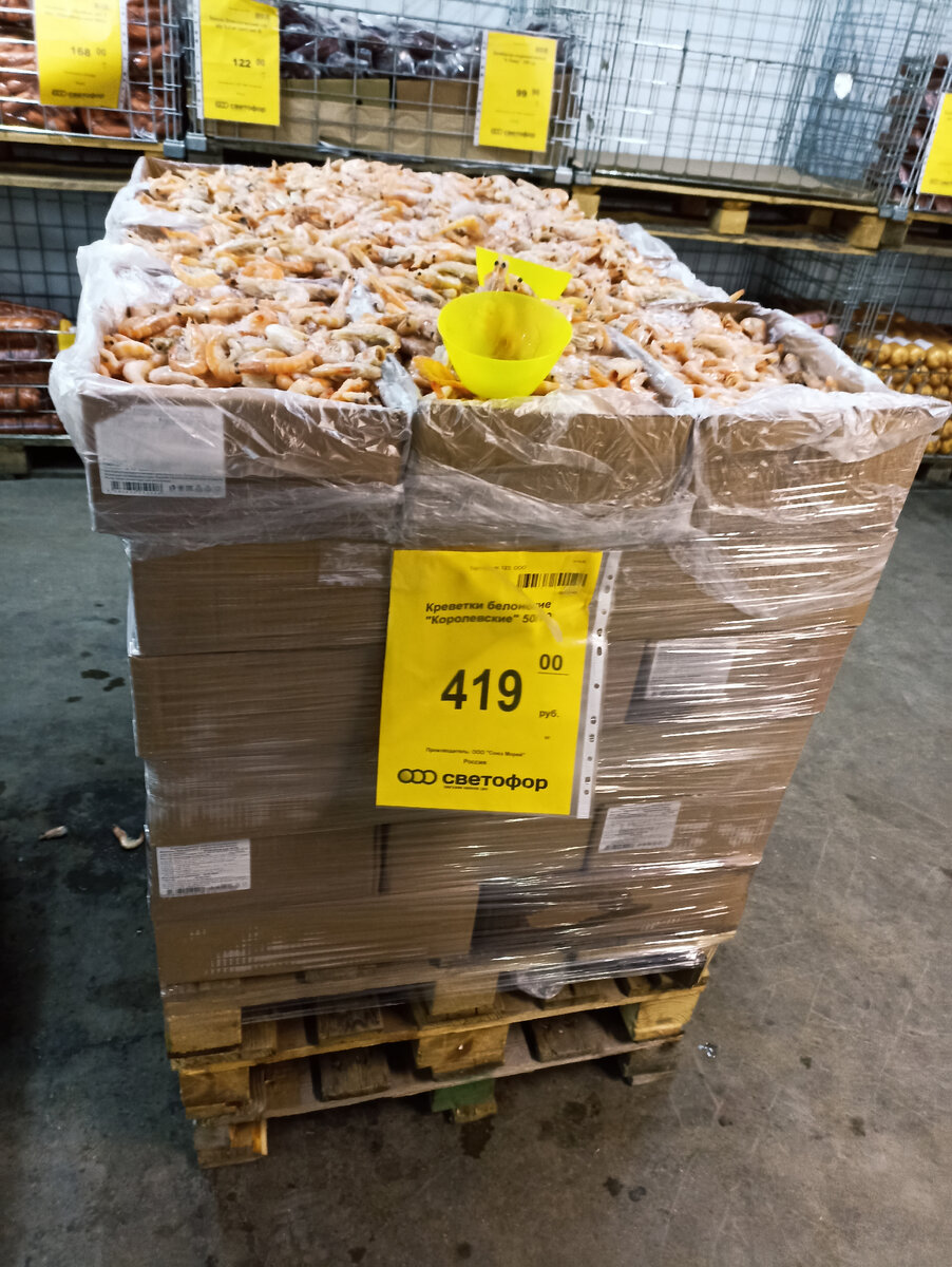 Приветствую вас, дорогие друзья и подписчики канала! Среди товаров "Светофора", каждому покупателю найдётся, что-то подходящее. Свежее мясо, креветки, лимонная кислота и даже мебель, всегда популярны в этом магазине из-за цены и качества. И в этом обзоре, делюсь с вами увиденным в "Светофоре" города Новороссийск. Королевские мороженые креветки среднего размера, целый поддон. Цена 419 рублей за 1 кг. Свежая свинина на кости со шкурой, нарезана кусками по 4-7 кг. Цена 176 рублей за 1 кг. Мороженая голень индейки от местных поставщиков. Цена 145 рублей за 1 кг. Квашеная капуста с морковью, в ведёрке 1 кг. Цена 54 рубля. Майонез провансаль "Ряба" из натуральных продуктов, в мягкой упаковке 1 кг. Цена 148 рублей. Сублимированный кофе Senator со вкусом ириски, в упаковке 100 грамм. Цена 117 рублей. Карамель леденцовая со вкусом арбуза из 10 штук по 15 грамм. Цена 87 рублей. Оливки без косточек Botanica, в железной банке с ключом 280 грамм. Цена 51 рубль. Пластмассовый комод из 5 секций разме