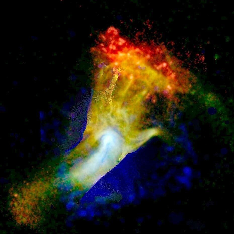 В 17 000 световых лет расположена необычная туманность, напоминающая огромную человеческую кисть. На снимке запечатлена взрывная волна и обломки взорвавшейся звезды, которые удаляются от места взрыва и сталкиваются со стеной из окружающего газа. Визуально это действительно напоминает гигантскую руку, упирающуюся в стену. На самом деле обсерватория сумела заснять следы события, которое произошло очень давно. По оценкам астрономов, свет от взрыва сверхновой достиг Земли около 1700 лет назад. В то время процветала империя майя, а Китаем правила династия Цзинь. Но этот период времени огромен только по человеческим меркам. По космическим стандартам данное событие является одним из самых молодых в нашей галактике Млечный Путь.