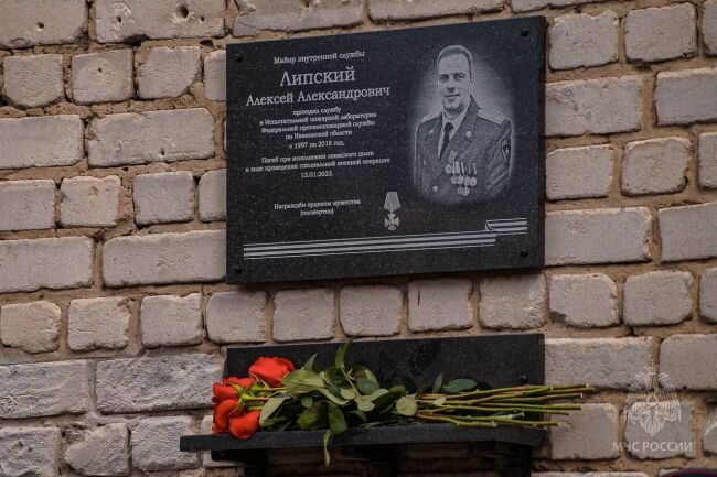 Сегодня в Иванове состоялось открытие мемориальной доски в честь майора внутренней службы Алексея Липского. Он погиб в ходе спецоперации в Украине 13 января этого года и за проявленные мужество и отвагу был награжден орденом Мужества посмертно. Как сообщили в пресс-службе областного ГУ МЧС, по решению руководства ведомства и лаборатории, а также ветеранов мемориал был установлен на здании испытательной пожарной лаборатории. Под залпы траурного салюта мемориальную доску открыли вдова Алексея Липского Светлана и действующий начальник областной испытательной пожарной лаборатории Роман Коровин. После присутствующие возложили к мемориалу цветы. Михаил Кабанов - полковник внутренней службы в отставке и ветеран испытательной пожарной лаборатории – рассказал о герое следующее: «Алексей Липский с 1997 по 2018 годы проходил службу в Испытательной пожарной лаборатории по Ивановской области. Был прекрасным специалистом, сам готовил и обучал молодых сотрудников. За период его работы лаборатория выш