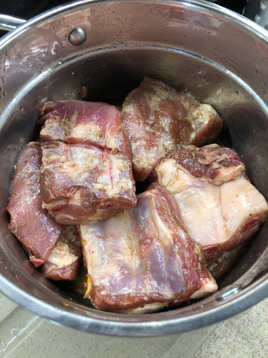 Как говорится "не спиртом единым" надо же и закусывать... И вообще нападает на меня иногда поварёнок - готовлю шедевры. Вот так вот практически без подготовки, как говорил один известный человек: пришёл (в магазин), увидел и купил. Как жаркое готовить все помнят? Обжарили, закинули в горшок и в духовку... В магазине увидел рёбра свиные. Не супермаркетовскую нарезку где из мяса только слёзы между рёбер, а такую нормальную полоску рёбер от хребта до пуза и мяса там никто не срезал. Долго возится с разделкой конечно, надо же плёнку срезать, различный жирок убрать, порционно порезать. Получились 5 порционных кусков, нормальные такие, мужские. Маринуем их на час-полтора... Самое приятное после разделки, что остался суповой набор. Это верхняя часть с позвоночником и обрезь с пуза - на хороший суп пойдёт!!! Обжариваем рёбра с двух сторон. Я обжарил и сразу в утятницу скинул. Обжариваем морковку, мелко резать конечно не стоит. Да и жарим в том "соусе" что от мяса остался. Мужикам на заметку!!!