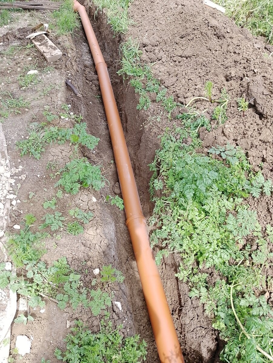 Трубу укладывали оранжевую, для уличных работ. Она потолще и покрепче. От дома до септика получилось метров двадцать. Участок чуть под уклон, почти как раз что бы получился нужный уклон, еще не много подчистили и получился нужный уклон, два сантиметра на метр трубы.