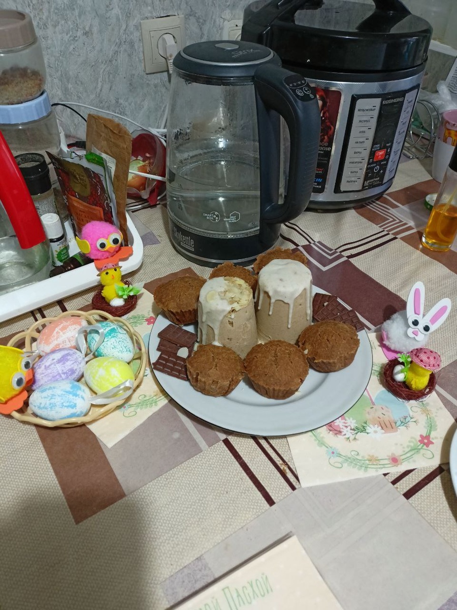 Поэтому я решила, что не буду дразнить своих деток, и сделаю все уже после того, как уложим их спать. Сказано — сделано! Утром на стол поставили «творожные» пасхи — но без творога, из гречки и кокоса. Кексы, как замена куличей, большие куличи есть некому, и самодельный шоколад. Сначала планировала сделать торт, но перенесла это на другой период, все таки традиция - есть традиция: