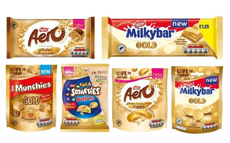 Позолоченные шоколадные изделия стали появляться у многих брендов. Дальше всех пошла компания Nestlé, выпустив линейку The Golden Collection. Продукция уже появилась на прилавках магазинов в Великобритании. Покупая золотой шоколад, ценители сладкого продукта, могут взглянуть на него по-новому. Стоит отметить, что в позолоту Nestlé одела несколько классических сортов темного, белого и молочного шоколада со вкусами, которые больше всего покупают. Речь о белом шоколаде, карамели и медовых сотах. Теперь эти продукты доступны в «драгоценном» оформлении.