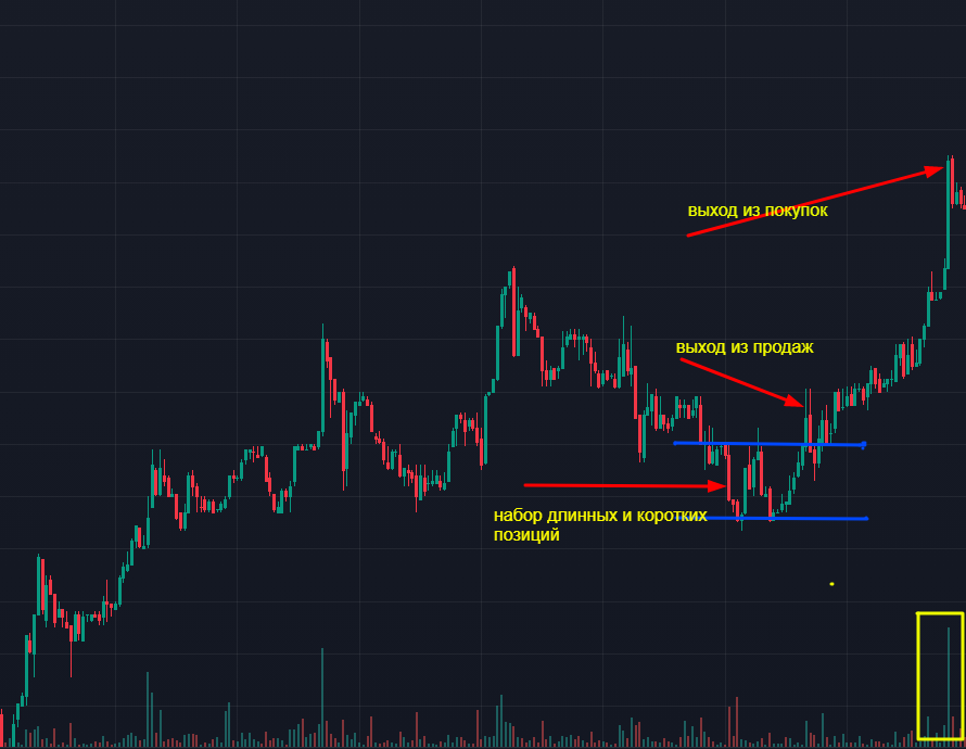 Крупные игроки никогда не спешат занять позицию. Если цена цена акции отходит от цены, по которой они хотят занять позицию, и если нет возможности вернуть ее обратно, то позиция просто игнорируется. Как правило, основная часть позиции принимается во время консолидации в течение дня. Цена удерживается в определенном диапазоне до тех пор, пока вся позиция не на берется. Затем происходит движение в стороны следующего ценового диапазона и появляется еще один крупный игрок. Как выйти из крупной позиции? Существует два типа выхода из позиции (тейк-профит) - внеплановый - при плановом закрытии позиции с тейк-профитом. (тейк-профит) и выход со стопом. Закрытие по тейк-профиту происходит при трендовом движении. Закрытие по тейк-профиту происходит, когда трендовое движение начинает материализовываться и ускоряться, поскольку средние и мелкие игроки входят в направление тренда. Направление тренда средними и мелкими игроками Крупные позиции закрываются относительно небольшими контртрендовыми иг
