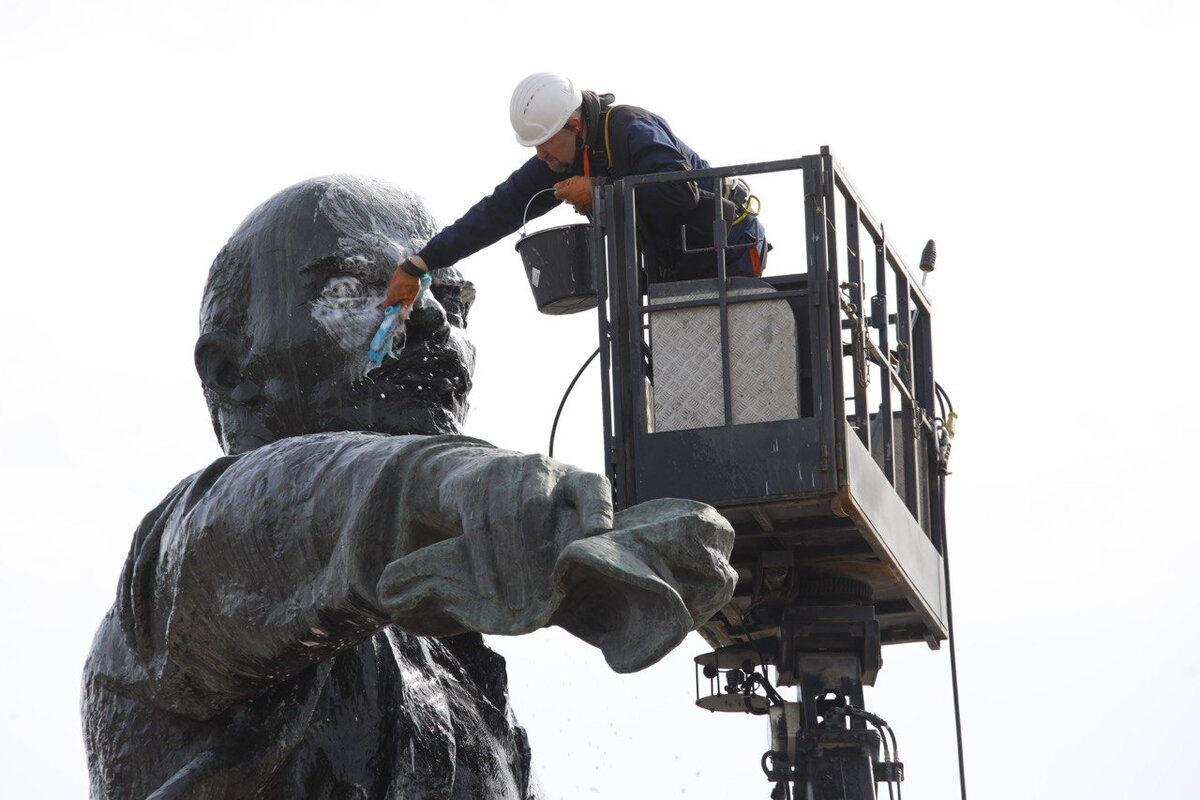 Ленин на Московской площади принял душ. Ему почистили и пальто с кепкой После долгой зимы в Петербурге моют не только улицы — чистыми нужно быть и памятникам. Банные процедуры 18 апреля устроили фигуре Владимира Ленина на Московской площади, что не укрылось от глаз фотокорреспондента «Фонтанки». Чтобы поравняться ростом с Лениным, специалисту пришлось подняться наверх в специальной кабинке. Сначала памятник покрыли моющим средством, а потом окатили из «душа». Помывка памятников в Петербурге стартовала накануне — первой стала фигура Александра Пушкина на площади Искусств. Как уточнили в пресс-службе Музея городской скульптуры, сезон профилактической реставрации начинается в середине апреля — начале мая, в зависимости от погоды. Сначала специалисты осматривают памятник и делают фотофиксацию, затем наносят на него специальное средство с нейтральным ph, которое позже смывают. Также тщательно промывают и монумент. Каждый год служба по текущему уходу за памятниками промывает более 100 скульп
