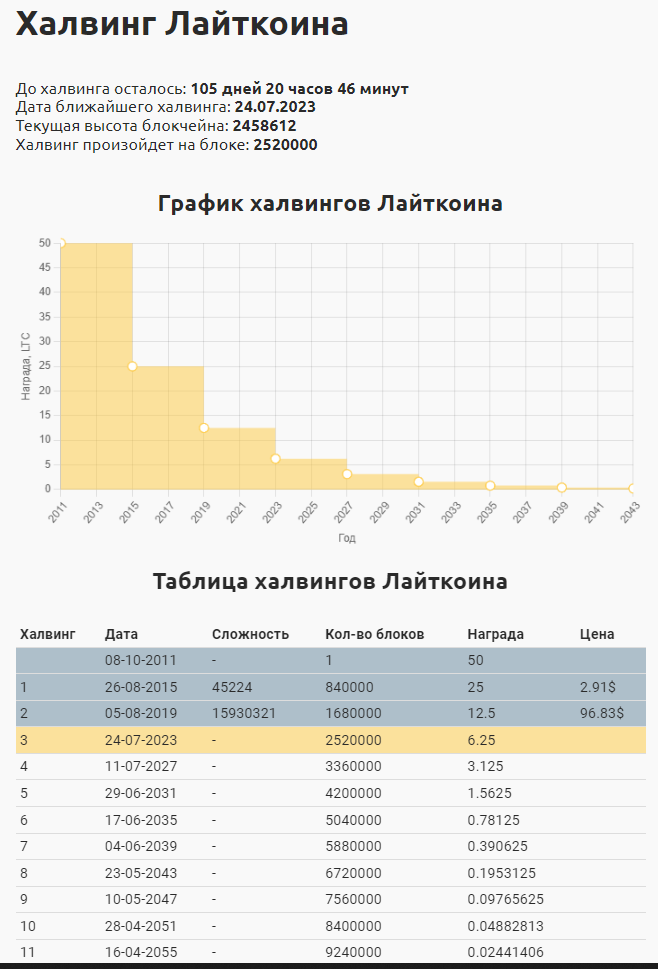 Всем привет! К концу июля - первой половине августа 2023г. ожидается Халвинг (т.е. снижение награды за добычу блоков) криптовалюты лайткоин (LTC). Даты примерные, поскольку халвинг происходит не в назначенную дату, а на определенном блоке в цепочке блокчейна и точное время его добычи нельзя предсказать без погрешностей, так в расчётах много переменных.