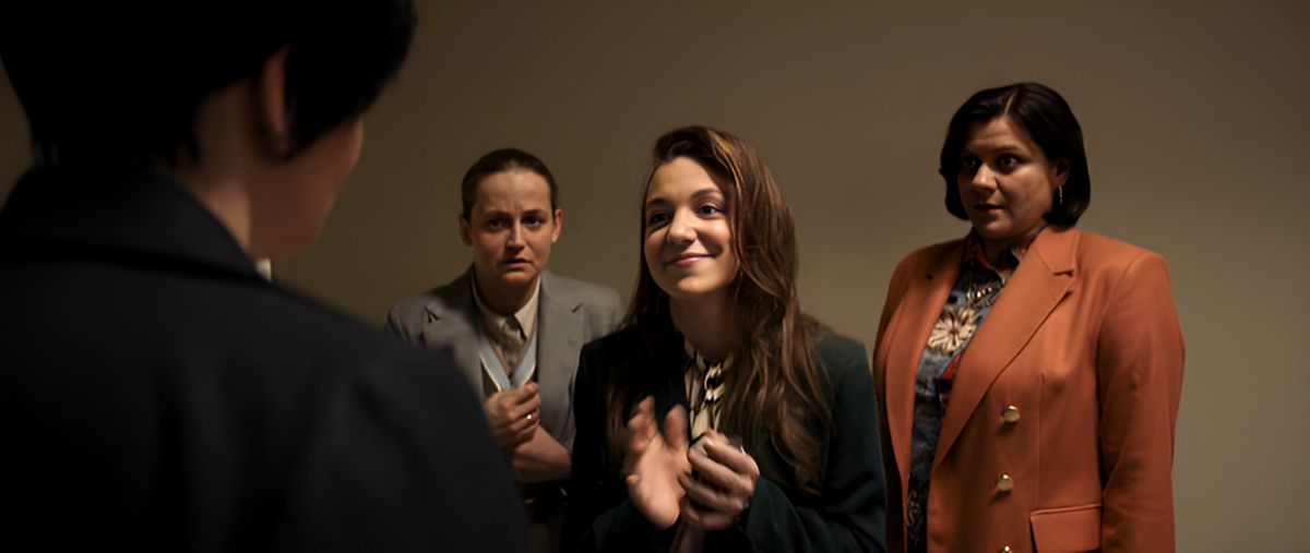 Вот ей и попадаются на выходе с работы три ее бухгалтерши, которые в подземном гараже в тихаря бухают. Отмечают день рождения подруги. Уже хорошие. Но еще опасаются. Ведь про себя подчиненные зовут Жанну-Медею су...й.