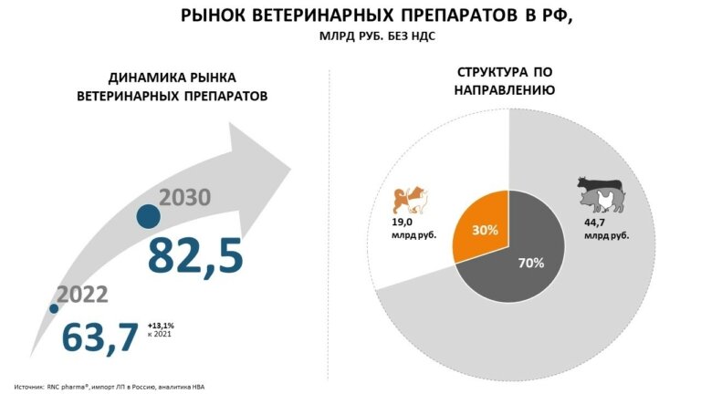 Объем производства ветпрепаратов в России достигнет 82,5 млрд рублей к 2030 году. Об этом говорится в исследовании Национальной ветеринарной ассоциации. Эксперты НВА пришли к выводу, что рост производства отечественных ветпрепаратов в 2022 году и меры господдержки приведут к дальнейшему сокращению зависимости страны от импорта. В 2022 году объем производства всей ветеринарной фармацевтики в РФ составил 63,7 млрд руб. По сравнению со стабильной цифрой 54-56 млрд руб. за период с 2019 по 2021 год это стремительный рост, считают в НВА. В исследовании также отмечается, что доля российской продукции на рынке ветпрепаратов с 2018 по 2022 год выросла с 30 до 43%. При этом в сегменте ветеринарных препаратов для сельскохозяйственных животных 61% (27,2 млрд руб.) пока еще приходится на импорт, еще 39% (17,5 млрд руб.) – на российское производство. Потенциал для замещения импортных препаратов в России есть – производство вакцин с 2018 года увеличилось в 2,3 раза, гормонов – в 2 раза, а всех катег