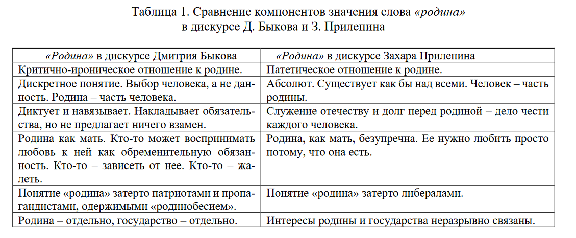 Оба рассматриваемых нами автора: Д. Быков и З. Прилепин – рождены в СССР, что, казалось бы, должно обусловливать совпадение денотата, но, как показал наш анализ, это не так. Говоря о родине, оба писателя апеллируют к образу России, однако и когнитивный, и прагматический макрокомпоненты значения слова «родина» у них значительно различаются