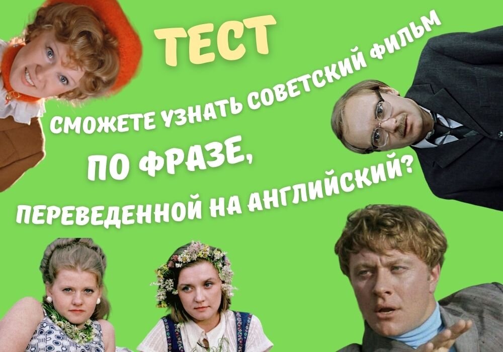 Все мы обожаем советские фильмы и их бесконечное множество крылатых фраз и выражений. Попробуйте пройти тест и узнать фразы, переведенные на английский язык, из своих любимых фильмов. А вот еще немного викторин, которые могут заинтересовать вас после прохождения текущей: А после прохождения теста пишите в комментариях - сколько ответов знали, а сколько выбрали наугад. Хвастайтесь, жалуйтесь, сравнивайте себя с другими читателями. Будет интересно! Good luck! Если было интересно и полезно - не забудьте поставить лайк, а также подписаться на канал, чтобы не пропустить ничего нового.