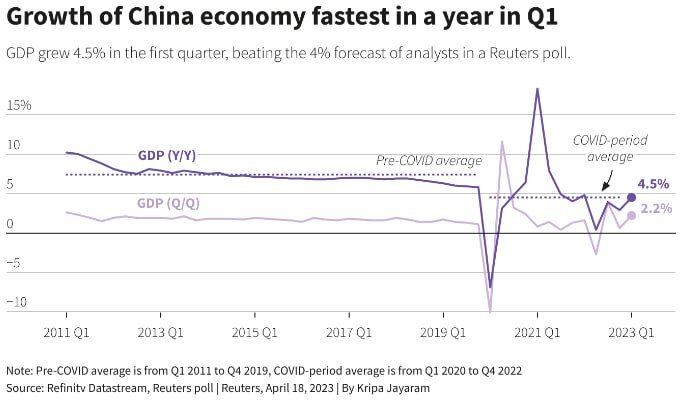 Экономика Китая росла более быстрыми, чем ожидалось, темпами в первом квартале, поскольку отмена строгих ограничений на распространение COVID избавила предприятия и потребителей от разрушительных последствий пандемии, хотя встречные ветры глобального замедления указывают на то, что впереди ее ждет нелегкий путь.