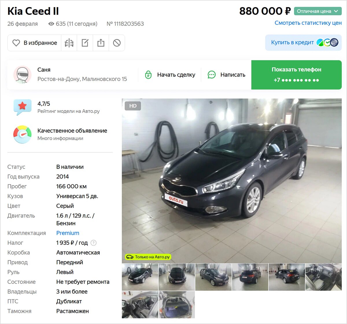 Следующие три с лишним года ничего особенного с машиной не происходило. Купивший Ceed человек наездил ещё около 50 тысяч километров и решил продать пятидверку в августе 2021-го. И она, вероятно, опять оказалась в руках перекупщика — буквально через два месяца Kia вновь была выставлена на Авто.ру! Практически с тем же пробегом, но новым описанием и увеличившейся ценой.
