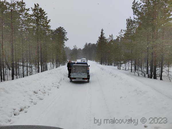 Самый сложный участок - это от базы до нормального зимника, за которым следят нефтяники. И вот здесь нас ждал первый и последний сюрприз. Гипотетические размышления накануне о встрече "встречки" на этом самом узком участке превратились в реалии. Единственное, что нас спасло от минимум пары/тройки часов махания лопатами - это то, что встреча произошла в 50 м от развилки. Видимо всевышний был на нашей стороне, встреча в любом другом месте означала работу с лопатами.