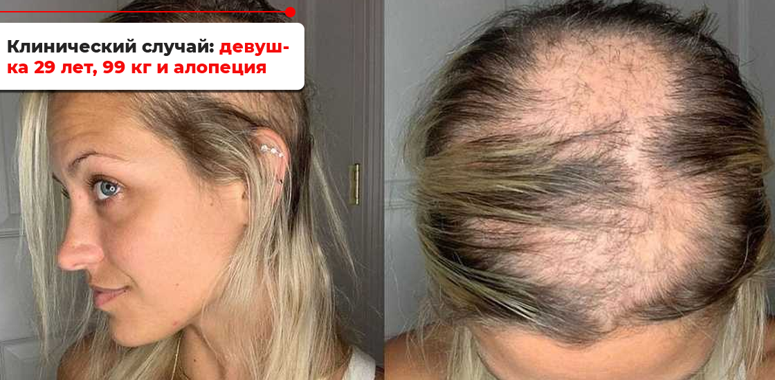 Причём это было в области лба, а девушке было 29 лет. С этой проблемой она прожила уже 5 лет, что, естественно, было очень неприятно и очень снижало качество её жизни. Несколько волосинок, которые росли в этом месте залысины, даже не окрашивались краской и были седыми. На каждую её мольбу о помощи в решении этой проблемы я отвечала, что не могу помочь, что я диетолог и занимаюсь снижением веса. В результате нашей работы она пришла к желаемому весу – 60 кг.