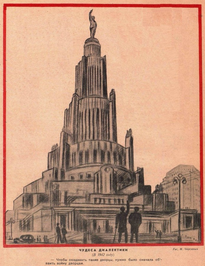 Рисунок Михаила Черемных. 1939 год. «Чудеса диалектики. (В 1942 году). — Чтобы создавать такие дворцы, нужно было сначала объявить войну дворцам».