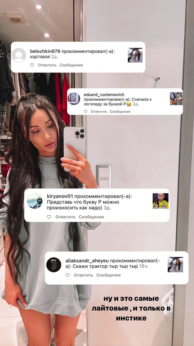 С детства я не выговариваю букву «р» так, как это делают ОСТАЛЬНЫЕ. И с детства это замечают люди и реагируют по -разному . Каждый божий день я получаю комментарии не только от тех, кому я нравлюсь , но и от хейтеров : * ты картавишь * да как так можно * куда смотрели твои родители Но вы думаете мне как-то волнует, меня это задевает? Нет, потому что с самого начала ведения блога я решила , что это моя фишка, изюминка! То что отличает меня от других , уникальная особенность- подчеркивающая мою индивидуальность ! Быть правильным со всех сторон , говорить как все - это скучно! Мои ролики набирают миллионы просмотров и этому никак не мешает моя «р». Наоборот, она помогает, она подталкивает людей, написать комментарий, вызывает реакцию и тем самым повышает активность ! Чтобы я делала, если бы прислушалось ко всем, кто говорит иди к логопеду и прочее? Стала бы как все ? Перестала бы выходить в интернет? Боялась каждый раз произнести неправильно слово, было бы скованный и зажатой