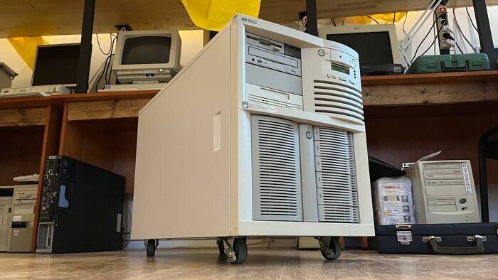 Сервер HP NetServer LH3 — в процессе реставрации, виден неоригинальный DVD-привод LH3 и LH6000 делят между собой общее шасси и младшая модель сравнительно легко может быть обновлена до старшей — требуется заменить основную системную плату, установить дополнительное охлаждение и приклеить новый шильдик из комплекта поставки. Само шасси — огромная по нынешним меркам “тумбочка” двойной ширины с прочными колесиками. Проверено — выдерживают более 100 кг дополнительной нагрузки — пару серверов Sun и HP сходного размера. Форм-фактор — реализация стандарта NLX в версии для мощных серверов. В настольном варианте в объединительную плату устанавливалась лишь материнка, основные слоты расширения располагались на самой объединительной плате. Здесь же она играет лишь роль распределителя питания — к ней подключаются блоки питания и система охлаждения. В два слота на ней устанавливаются материнская плата и плата ввода-вывода. Отсек блоков питания расположен сзади, в нижней части шасси. Базовой конфигурации установлен лишь один блок питания, всего же их можно установить два.
