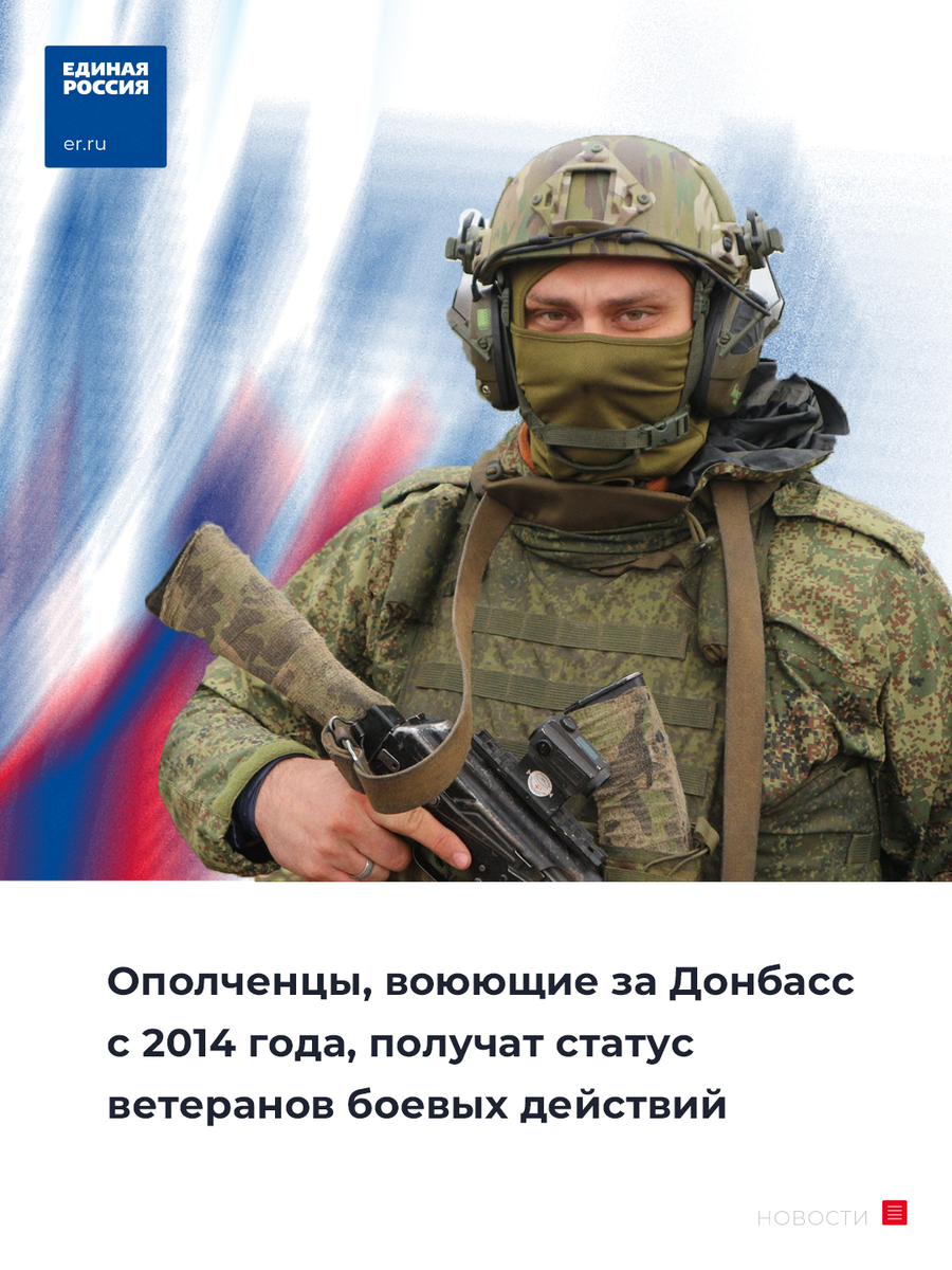 Ополченцы, воюющие за Донбасс с 2014 года, получат статус ветеранов боевых действий. Соответствующий законопроект Рабочей группы по вопросам СВО принят Госдумой в первом чтении. После вступления закона в силу ветераны войны на Донбассе и члены их семей смогут получать все положенные меры поддержки наравне с другими участниками СВО.