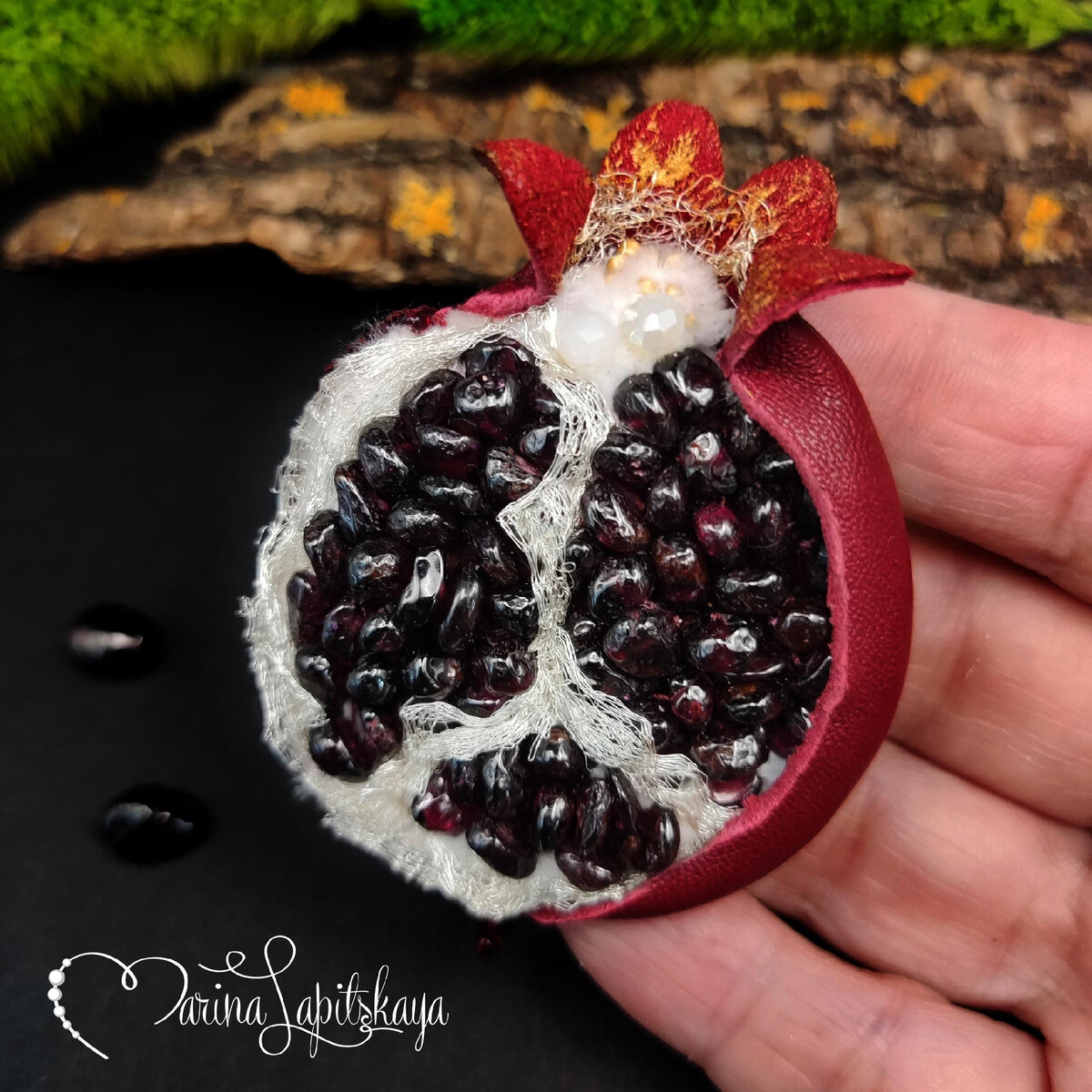 Драгоценный камень это Тёмно-красный — для браслета. Сок попить бы каждый рад, Что даёт нам плод гранат. В. Талызин В древнегреческой традиции гранат выступает как символ плодородия, процветания и супружества. В Армении верят что гранат помогает обзавестись потомством. А в Китае гранат символизирует изобилие. Гранат считался символом жизни у финикийцев, у которых он был атрибутом бога Солнца. Он также упоминается в ряде священных книг восточной традиции, в том числе и в Библии, где предстает в качестве образа красоты, а также как символ единства мира. Чтобы сделать брошь в виде граната, нам понадобятся: ▪️ фетр толщиной 1-1,5 мм (белый или красный), ▪️ акриловые краски по ткани, ▪️ бусины граната 5-7 мм, ▪️ бисер № 15 (Япония) - золотистый, ▪️ бисер № 10 (Чехия) - бордовый, ▪️ рондели 3х4 мм (белые, бежевые) - 2-3 шт., (бордовая) - 1 шт., ▪️ синель белая (бежевая), ▪️ сетка ювелирная (золотистая), ▪️ основа для броши длиной 4 см и 3 см - 2 шт, ▪️ зажигалка (свеча), ▪️ картон, ▪️ нитки