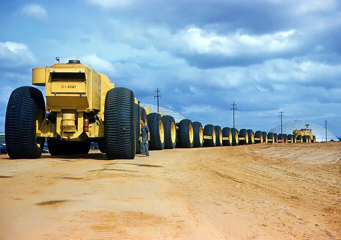 Давайте поговорим о необычном транспортном средстве, которое никогда не побывало на территории нашей страны - автопоезде LeTourneau TC-497. Этот мощный колесный гигант был разработан американскими инженерами в 1950 году по заказу министерства обороны. Его задачей было перевозить грузы по обычным дорогам в случае выхода из строя железнодорожного сообщения. Размеры этого автопоезда действительно впечатляют: длина составляет 173 метра, высота - 9 метров (если смотреть по кабине), а вес достигает 450 тонн. Такая машина может перевозить груз массой до 150 тонн, размещая их на 12 прицепах, которые крепятся за головную машину. Диаметр колес равен 3.5 метра, а на каждом из них установлен электромотор, питающийся от газотурбинного двигателя. Всего в автопоезде установлено 4 таких двигателя, общей мощностью в 5000 лошадиных сил. Стоит отметить, что идея создания такой машины была необычной, но, к сожалению, оказалась не очень перспективной в долгосрочной перспективе. Поэтому этот проект так и не