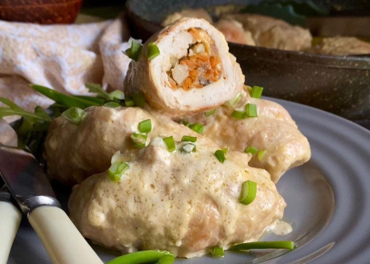 Это горячее блюдо станет отличным дополнением к праздничному столу, обязательно сохраните сохраните себе эту идею. Приветствуем Вас на канале "Вкусная жизнь". Самые вкусные и проверенные рецепты ждут вас в ленте. Присоединяйтесь, если ещё не с нами. Понадобится: Приготовление 1. Мясо нарезать на пластины. (Вместо куриного мяса можно использовать нежирную свинину). Слегка отбить. Посолить, поперчить, можно обмазать любимыми специями и оставить промариноваться на 20 минут. 2. А тем временем готовим начинку: 3. Выложить начинку на мясо и завернуть в рулетики. Скрепить края зубочисткой. 4. Обжарить рулетики со всех сторон до золотистого цвета и убрать их со сковороды. Вынуть из них зубочистки. 5. В сковороду, в которой жарились рулеты, выложить мелко нарезанный чеснок (можно выдавить через пресс). Влить туда же сливки, смешанные с водой. В получившийся соус выложить рулеты и тушить под крышкой до готовности, переворачивая их в процессе. Подавать рулетики можно с любым гарниром. Очень вкус